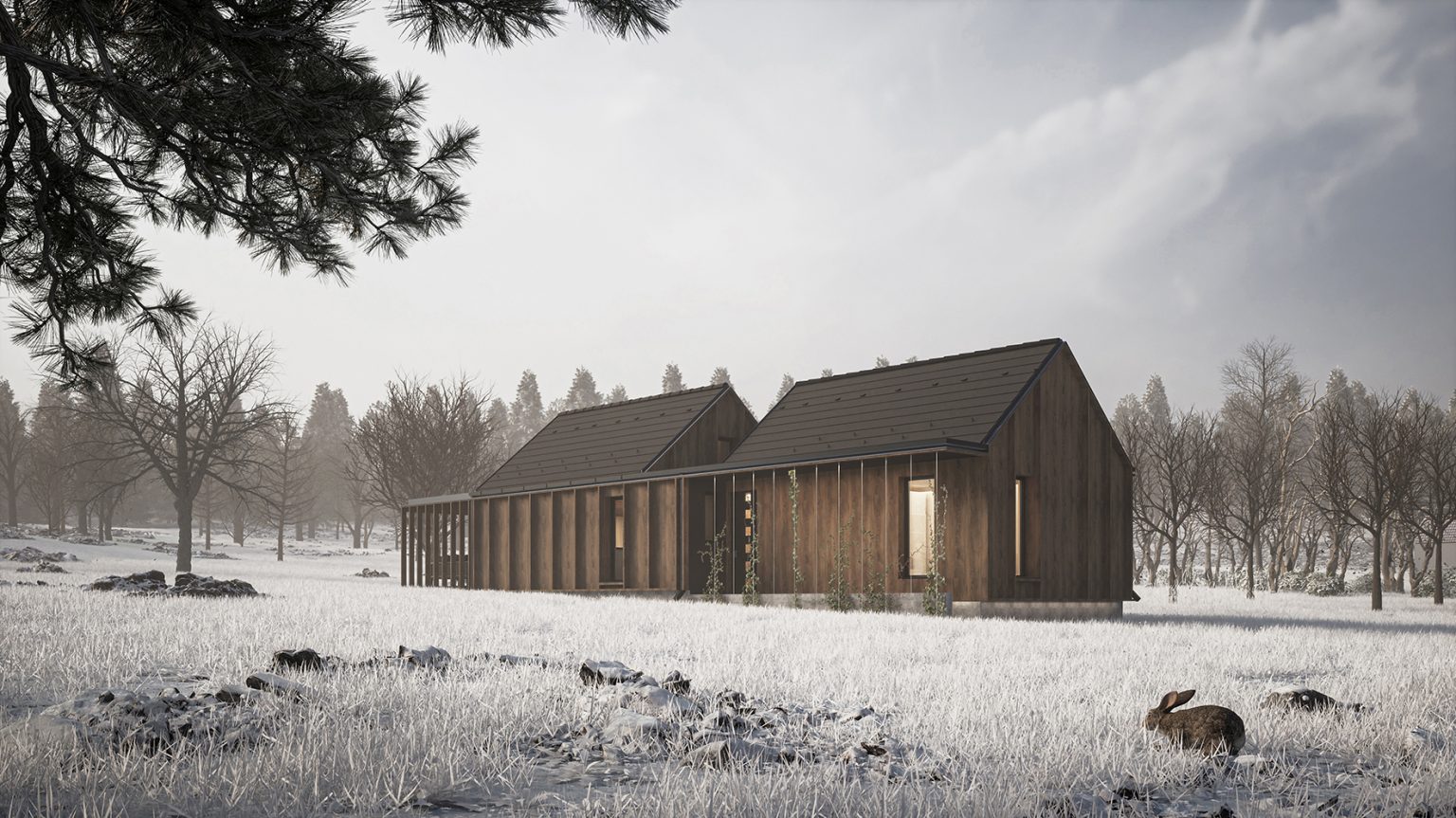 A végső épület, úgy, mint a rá tervezett cserép hatása is összességében minimalista. A két megtört tömeget a homlokzati ritmika tartja egy egységben, amely a váltakozó huzalokból és gerendákból áll. A tervezett épület sötét fa burkolatával és matt fekete fedésével úgy ad menedéket lakóinak, mint nyári napsütésben a környező fák koronáinak árnyéka.